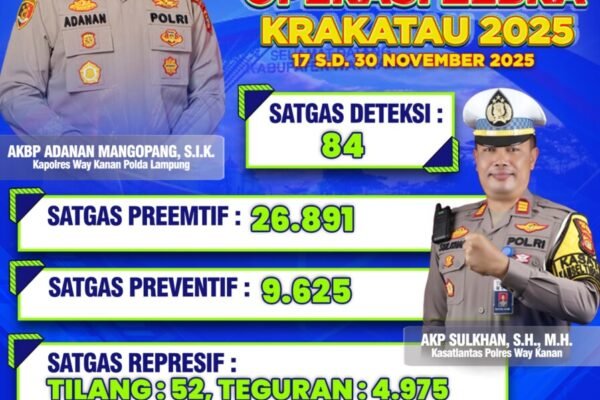Waykanan-Libas News7.com Operasi Zebra Krakatau 2025, telah selesai berlangsung hasilnya sedikitnya 4.975 pelanggar lalulintas diberikan sangsi teguran dan 52 lainnya diberikan Bukti Pelanggaran Lalu Lintas (Tilang) oleh Satlantas Polres Way Kanan Polda Lampung, Selasa (02/12/2025). Kapolres Way Kanan AKBP Adanan Mangopang melalui Kasatlantas AKP Sulkhan mengatakan bahwa kegiatan Operasi Zebra Krakatau telah digelar dari tanggal…