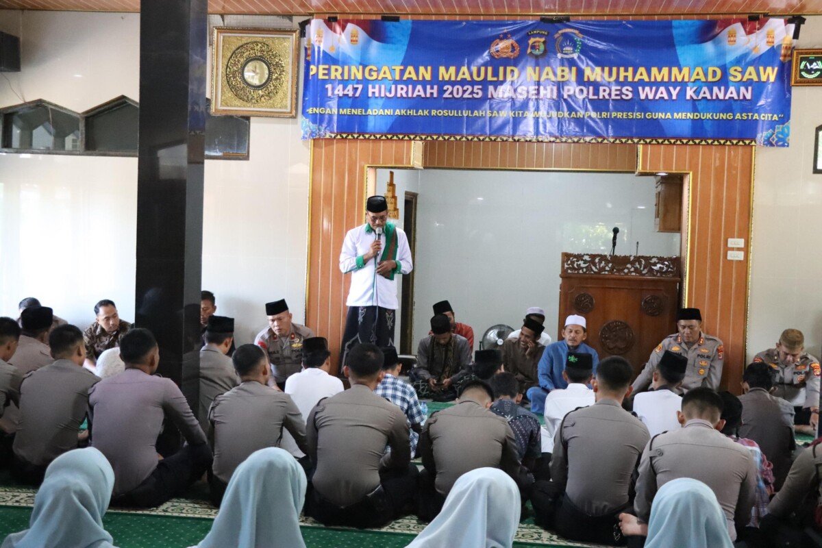 Polres Way Kanan menggelar doa bersama dan santunan anak yatim piatu, dalam rangka memperingati Maulid Nabi Muhammad SAW 1447 Hijriah yang bertempat di Masjid Darul Fattah Polres Way Kanan. Jum’at (05/09/2025).
