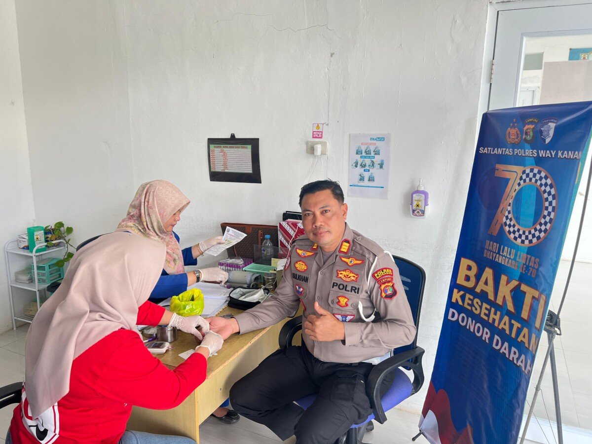Kapolres Way Kanan AKBP Adanan Mangopang melalui Kasatlantas Polres Way Kanan AKP Sulkhan menuturkan, pihaknya turut berpartisipasi menyumbangkam darahnya dalam rangka Hari Lalu Lintas Bhayangkara ke-70 tahun 2025.