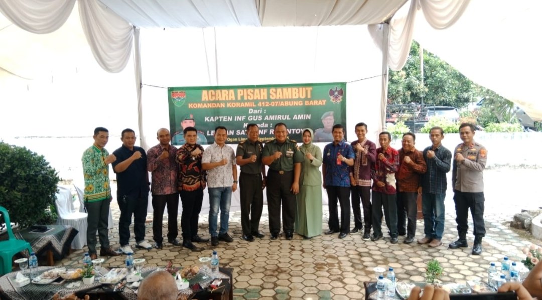 Camat Abung Pekurun, Hantaran, S.E., M.M., bersama para kepala desa menghadiri acara pisah sambut Komandan Koramil 412-07/Abung Barat dari Kapten Inf. Gus Amirul Amin kepada Letnan Satu Inf. Rihantoyo. Acara berlangsung di halaman Kantor Koramil Abung Barat, Jumat (19/9/2025).