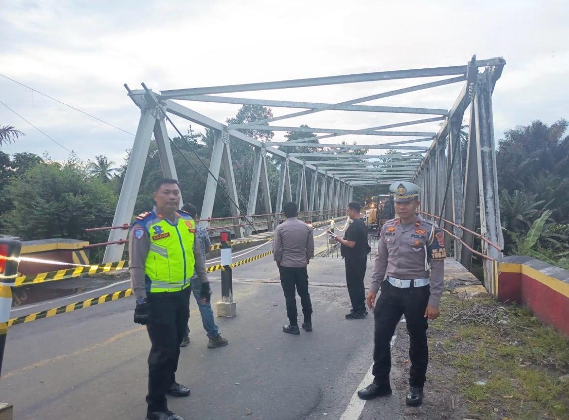 Kerusakan badan jalan jembatan tersebut dengan diameter sekitar satu meter terlihat anyaman cor besi nyaris amblas di bagian tengah badan jalan jembatan yang saat ini sedang dalam perbaikan.