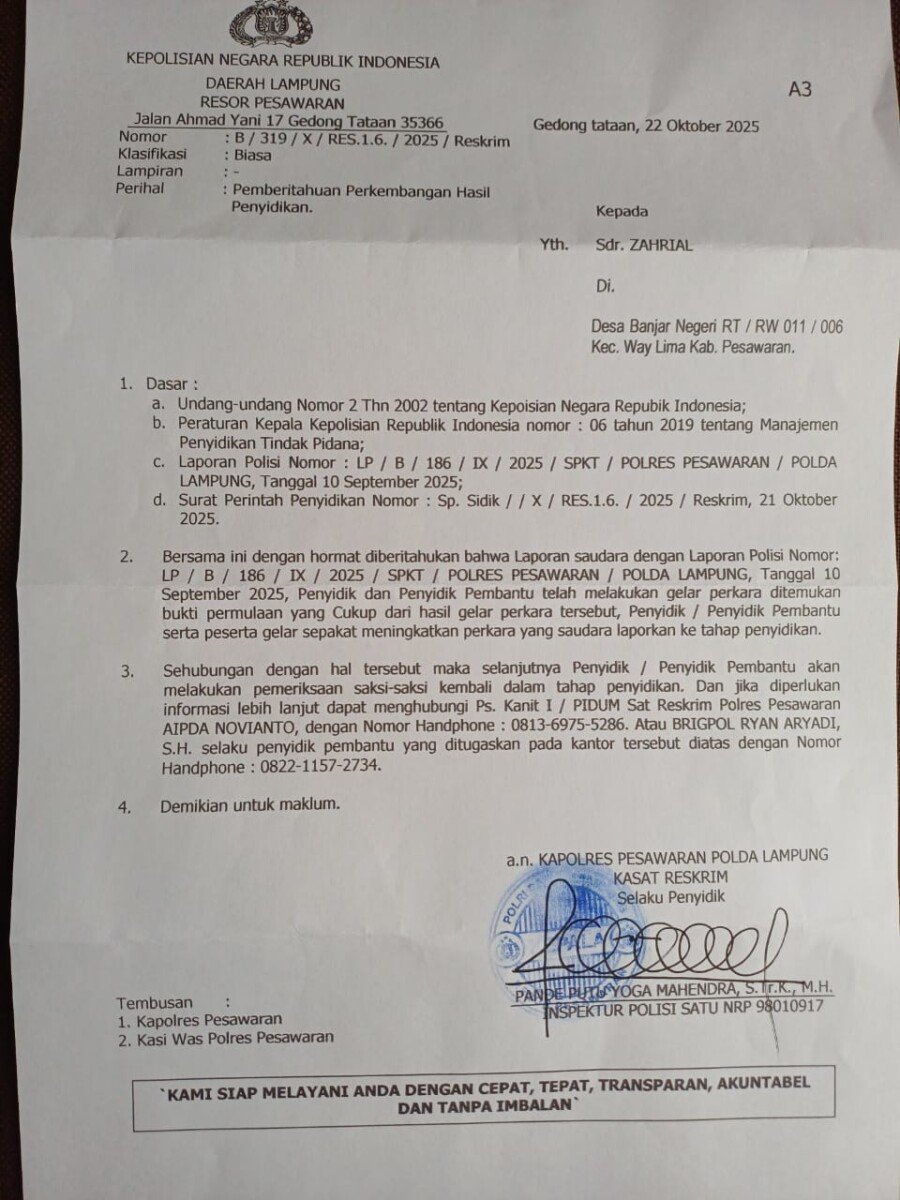 Direktur Reserse Kriminal Umum (Dirkrimum) Polda Lampung Kombes Pol Indra Hermawan menjelaskan, penyelidikan kasus ini dilakukan berdasarkan laporan polisi nomor LP/B/384/VI/2023/SPKT Polda Lampung tanggal 3 Juni 2025 dengan pelapor atas nama Wirna Wani.