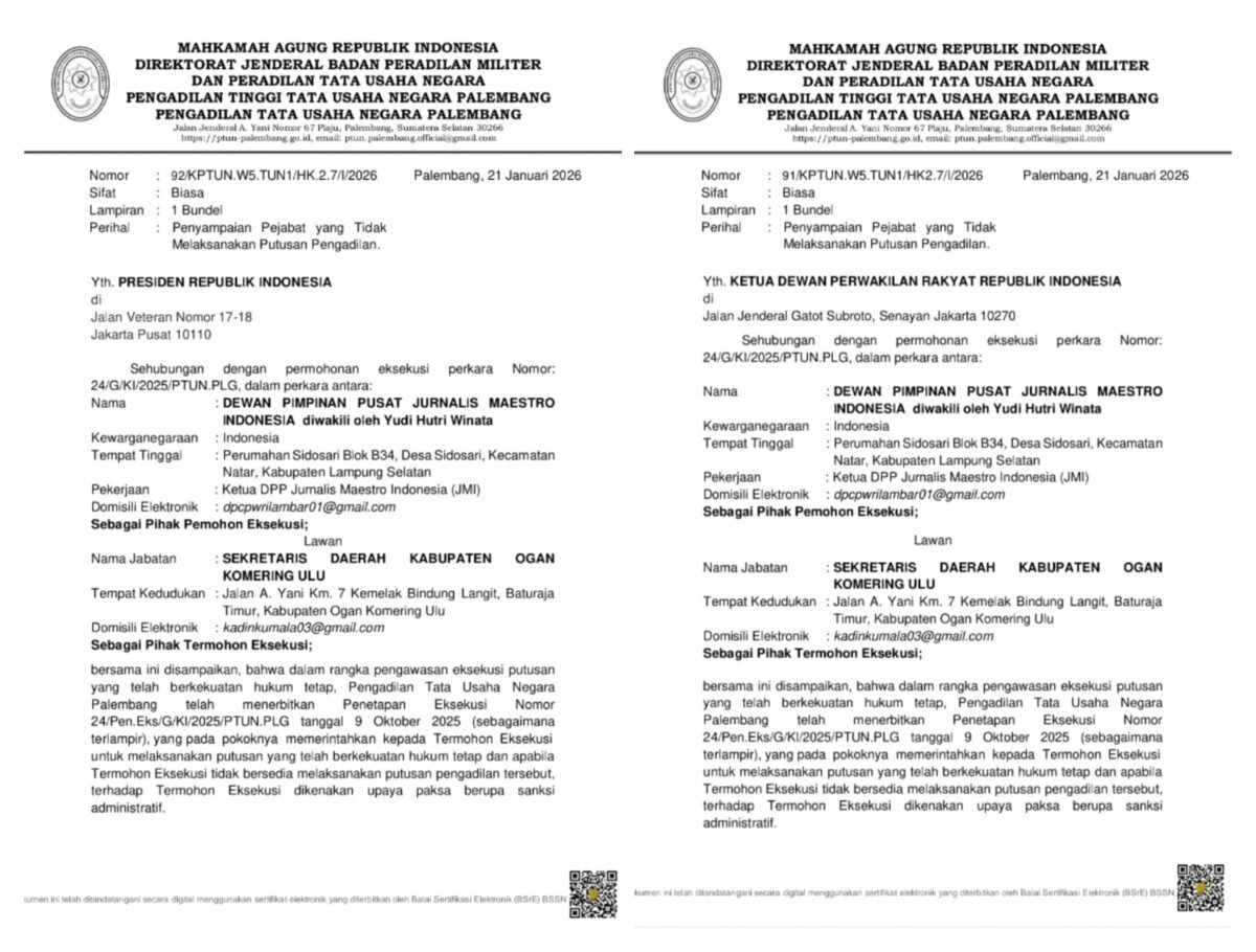 Langkah ini tertuang dalam Surat PTUN Palembang Nomor 92/KPTUN.W5.TUN1/HK.2.7/I/2026 yang ditujukan kepada Presiden Republik Indonesia, serta Surat Nomor 91/KPTUN.W5.TUN1/HK.2.7/I/2026 kepada Ketua DPR RI, tertanggal 21 Januari 2026. Surat tersebut memuat pemberitahuan resmi mengenai pejabat Pemkab OKU yang tidak melaksanakan putusan pengadilan meskipun telah diperintahkan melalui penetapan eksekusi .