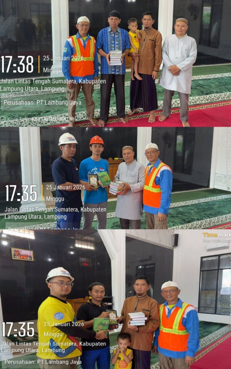 Pemimpin Tim Bakti Sosial PT Alfaq Global Energi (AGE), Purwanto, menyerahkan bingkisan berupa Al-Qur’an kepada pengurus Masjid Syuhada di Talang Jembatan, Kecamatan Abung Kunang, Kabupaten Lampung Utara, pada Minggu, 25 Januari 2026.