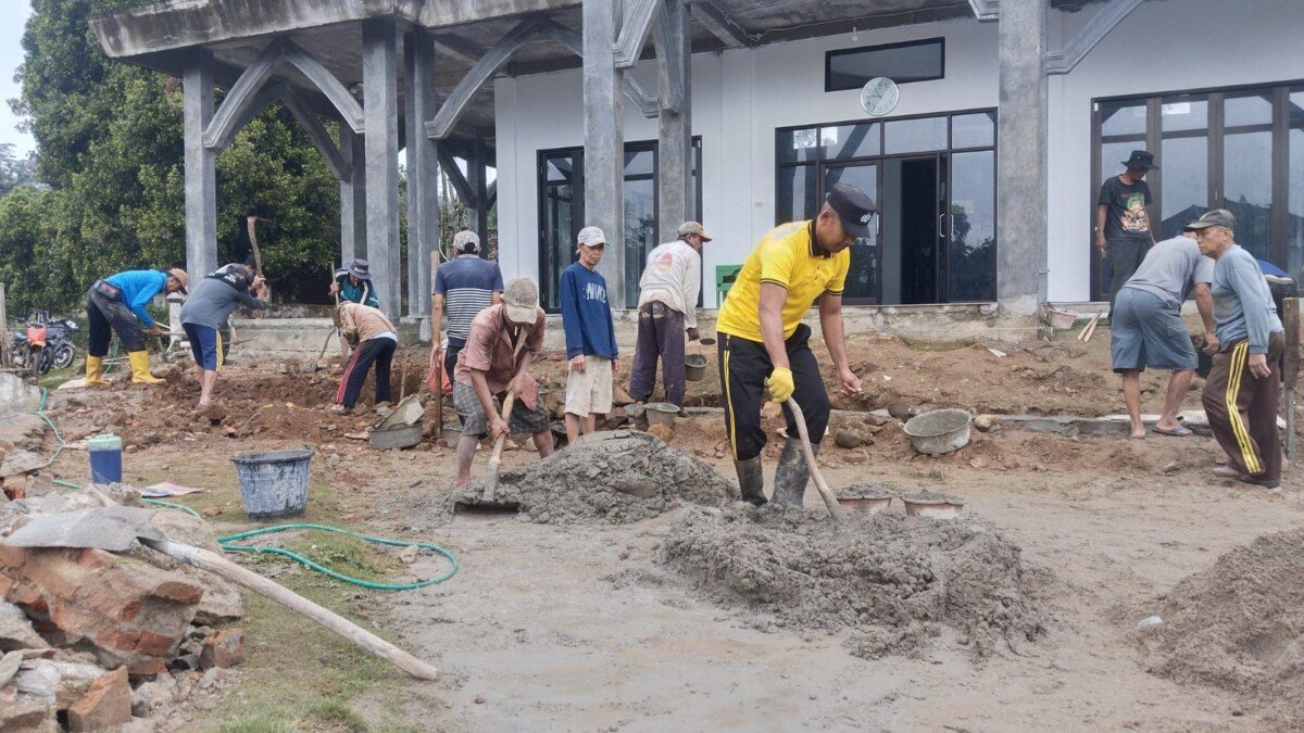 Ps. Kanit Binmas Aipda Eko Wahyudi bersama Kepala Kampung Talang Mangga Igap Sujiman dan warga untuk melaksanakan giat gotong royong pembuatan teras Masjid dan perapihan untuk dipergunakan dalam beribadah pengajian dan menyambut datangnya Bulan Suci Ramadhan 1447 H.