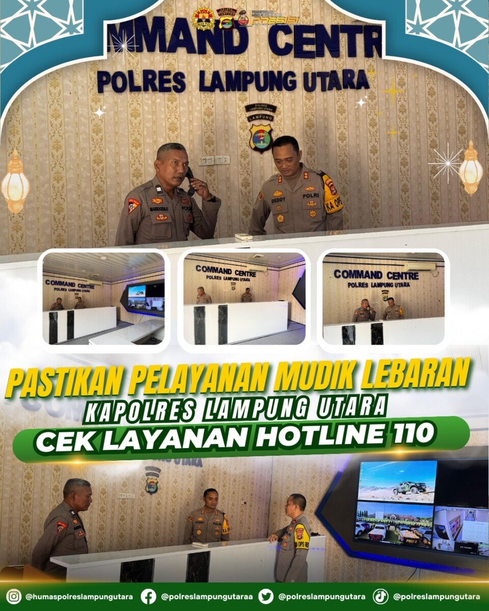 Lampung Utara Libasnews7. Com – Untuk memastikan pelayanan kepada masyarakat yang akan mudik lebaran Idul Fitri 2025 sudah berjalan maksimal, Kapolres Lampung Utara mengecek langsung layanan call center 110 Polres setempat, Kamis (13/3/25).