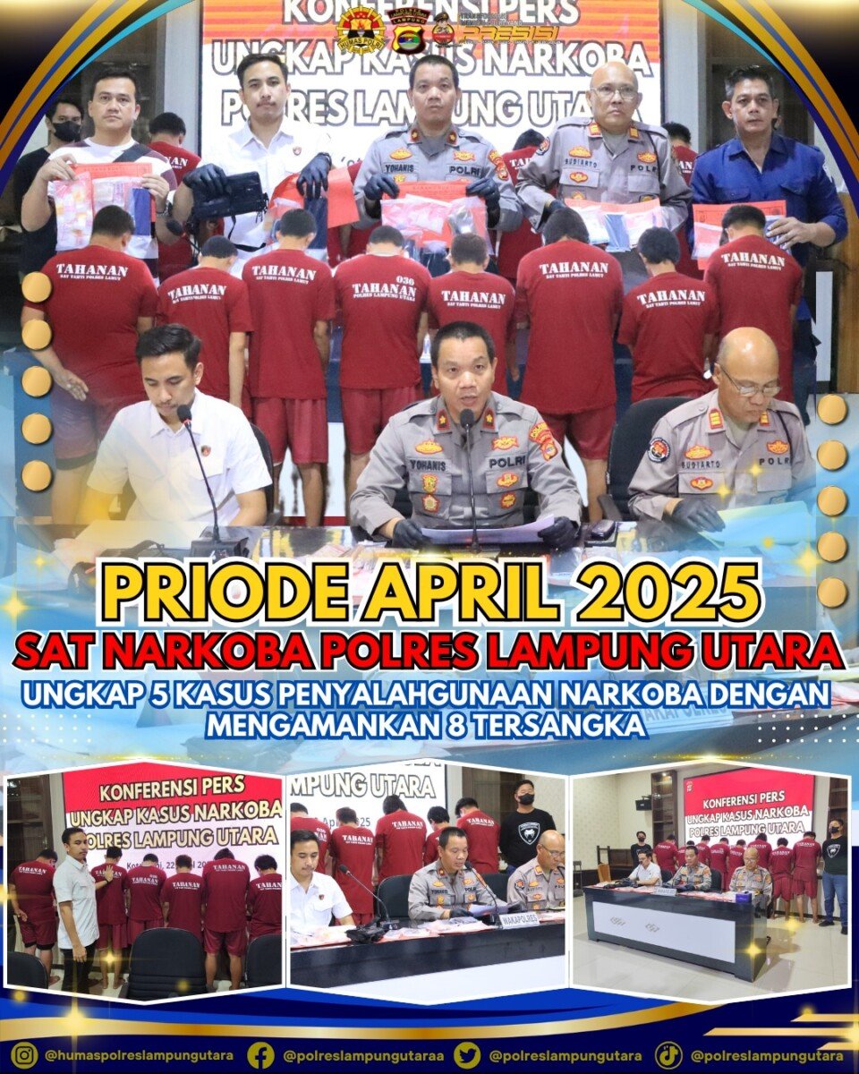 “Penangkapan 8 orang tersebut hasil dari 5 pengungkapan kasus tindak pidana narkotika” kata Waka Polres Lampung Utara, Kompol Yohanis, saat Konperensi Pers. Selasa (22/4/2025)