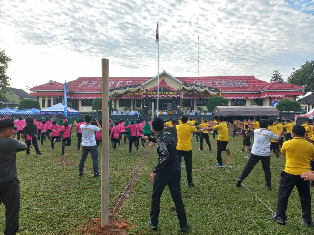 Olahraga diawali dengan jalan santai mulai start dari halaman Mapolres selanjutnya bergerak menuju simpang empat Negeri Baru sesampainya disana, kemudian Finish di Polres Way Kanan dengan jarak yang ditempuh sejauh 2(dua) Km lalu dilanjutkan senam, voli dan futsal.