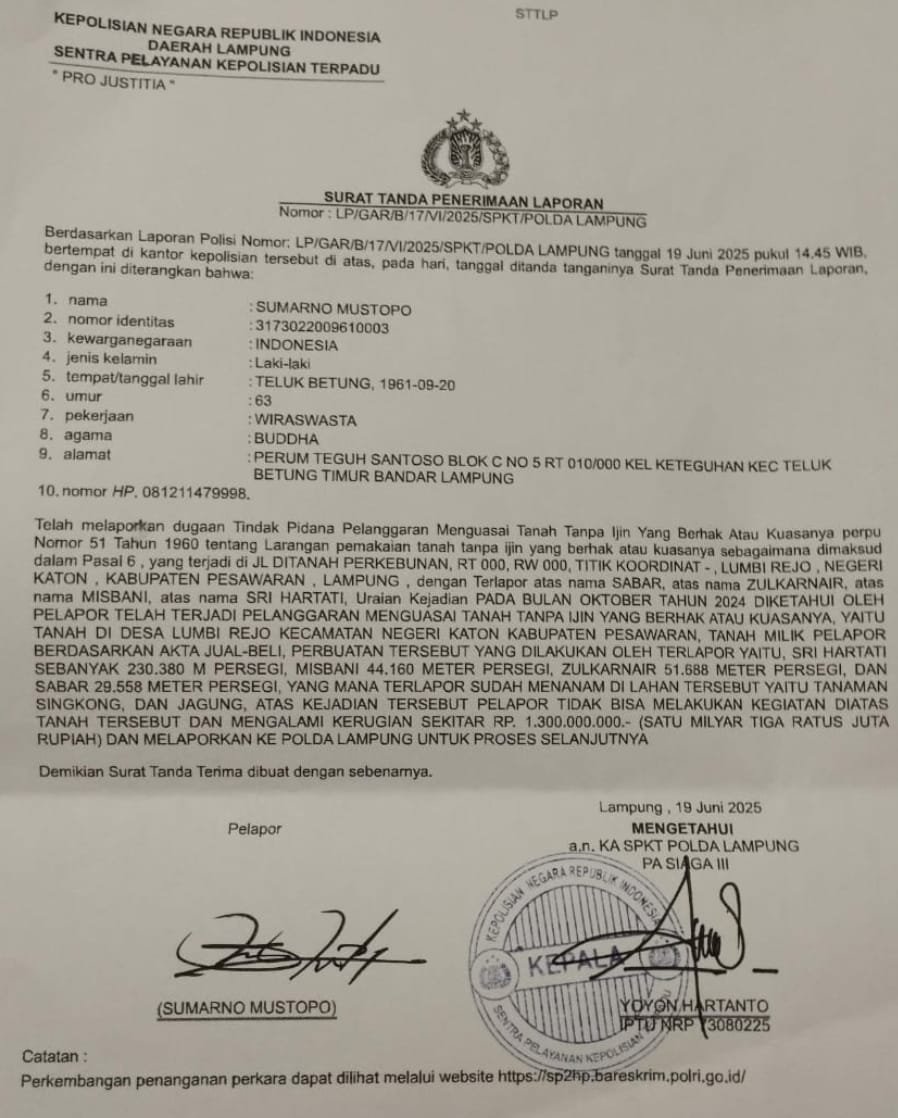Laporan tertuang dalam LP /GAR/ B/17/VI/2025/SPKT/POLDA LAMPUNG tanggal 19 Juni 2025 atas nama pelapor Sumarno Mustopo.