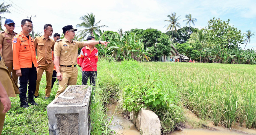 Selain menyerahkan bantuan, Bupati Egi meninjau titik lokasi banjir di Desa Merak Belantung sembari mencari penyebab banjir. Di bawah terik matahari, Bupati Egi berjalan kaki melewati jalan becek menyusuri area persawahan memastikan akar persoalan penyebab banjir.