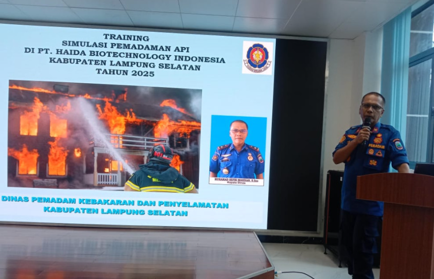 Tanjung Bintang – Kepala Dinas Pemadam Kebakaran dan Penyelamatan (Damkarmat) Kabupaten Lampung Selatan, Sefri Masdian, memberikan Sosialisasi Pencegahan Kebakaran sekaligus Training Simulasi Pemadaman Api di PT Haida Biotechnology Indonesia, Tanjung Bintang, Lampung Selatan, Selasa (15/4/2025).