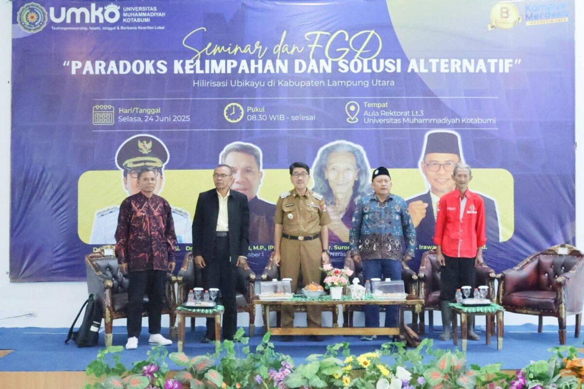 Bupati Lampung Utara, Dr. Ir. Hamartoni Ahadis, M.Si., menghadiri dan membuka Seminar serta Forum Group Discussion (FGD) bertema βParadoks Kelimpahan dan Solusi Alternatifβ yang digelar di Universitas Muhammadiyah (UM) Kotabumi. Acara ini mengangkat isu strategis tentang hilirisasi ubi kayu, sebagai komoditas unggulan yang berlimpah di Kabupaten Lampung Utara.