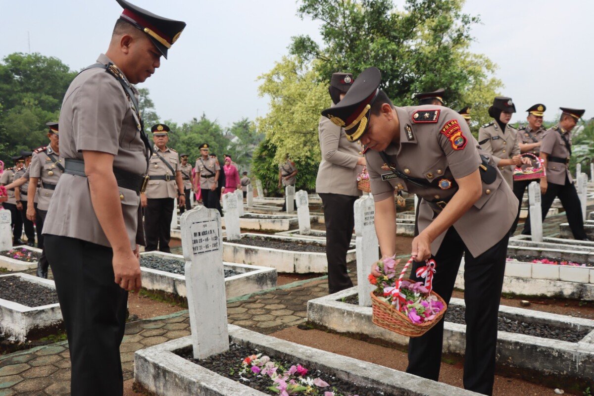 Memperingati Hari Ulang Tahun Bhayangkara Ke-79, Polres Lampung Utara menggelar upacara ziarah dan tabur bunga di Taman Makam Pahlawan (TMP) Kabupaten setempat, Selasa (24/6/24).