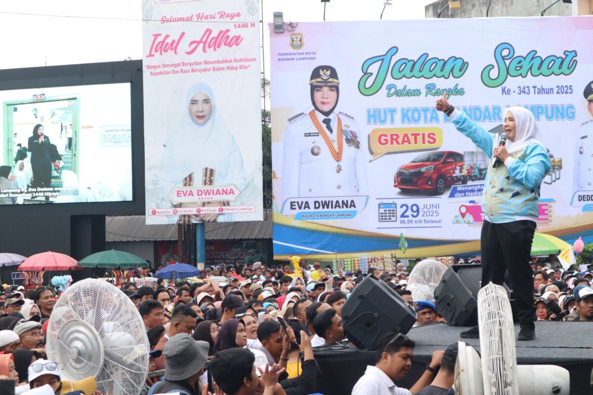 Wali Kota Bandar Lampung Hj. Eva Dwiana secara resmi membuka kegiatan Jalan Sehat dalam rangka memperingati Hari Ulang Tahun (HUT) ke-343 Kota Bandar Lampung pada Minggu, 29 Juni 2025, di Tugu Adipura.