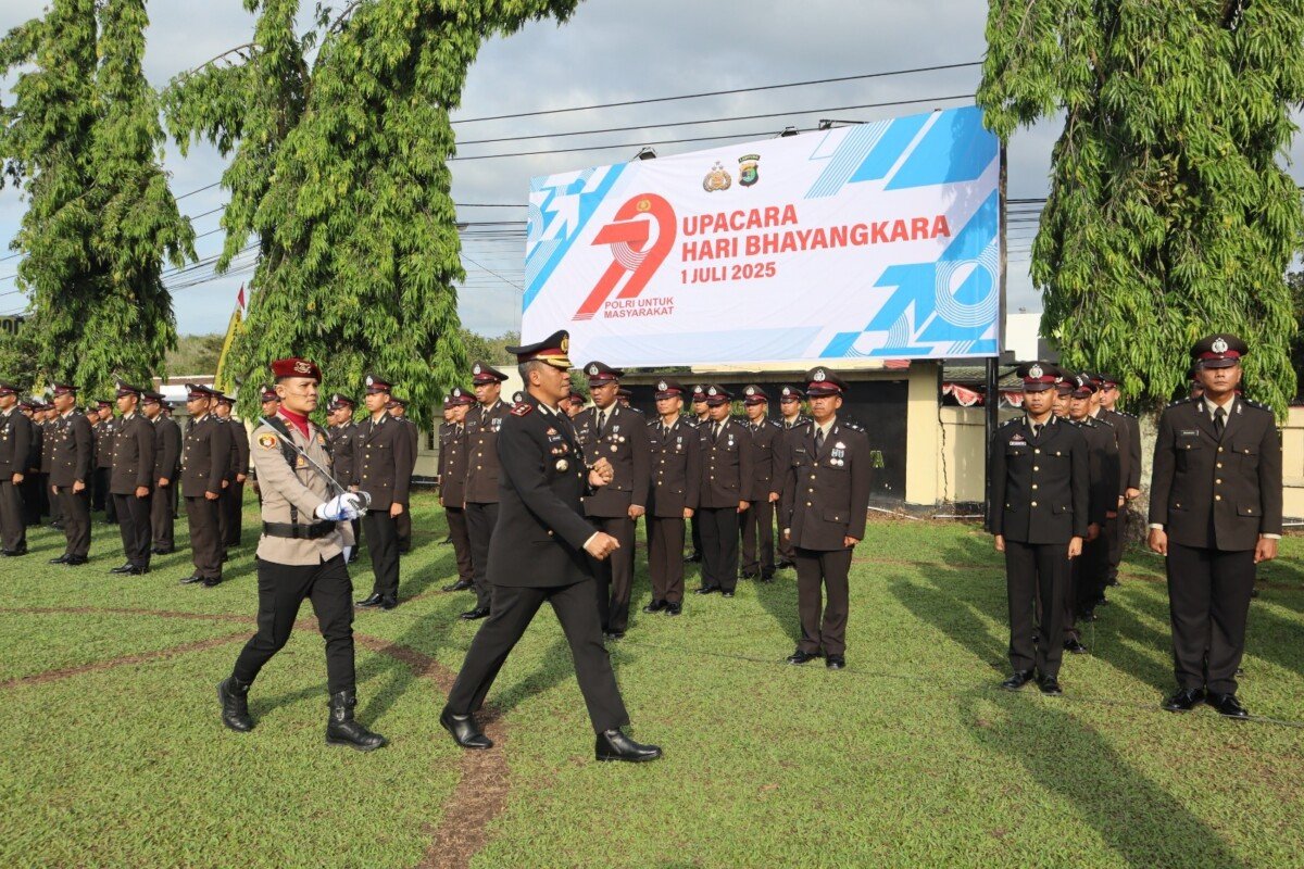 Kapolres AKBP Adanan Mangopang bertindak selaku inspektur upacara membacakan sambutan dari Kepala Kepolisian Negara Republik Indonesia Jenderal Polisi Drs. Listyo Sigit Prabowo, M.Si. bahwa dalam rangka upacara dan syukuran peringatan Hari Bhayangkara ke-79 tahun 2025.