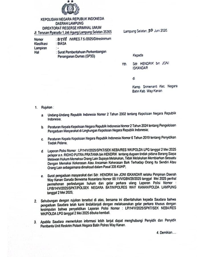 Hal tersebut tertuang dalam Surat Pemberitahuan Perkembangan Penanganan Dumas (SP3D) Nomor: B/588/VI/RES.7.5/2025/DITRESKRIMUM tertanggal 30 Juni 2025. Surat tersebut ditandatangani oleh AKBP Feizal Reza Harahap, S.E., M.Si., selaku Wadir/Kabag Wasidik Ditreskrimum Polda Lampung.