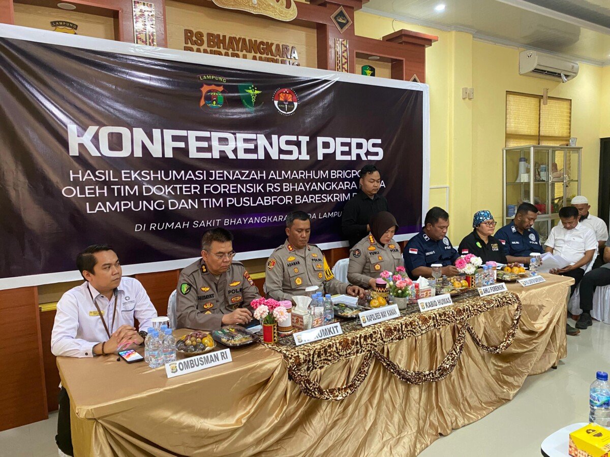 Kapolres Way Kanan AKBP Adanan Mangopang didampingi Kasatreskrim AKP Sigit Barazili, Kanit Resum Satreskrim Ipda Jamian D.T. Torop, sekaligus Puslabfor Bareskrim Polri AKBP Faizal Rachmad dan Kompol Irfan Rofik, melakukan konferensi pers hasil Ekshumasi Jenazah Almarhum Brigpol EA oleh Tim Dokter Forensik Rs. Bhayangkara Polda Lampung dan Tim Puslabfor Bareskrim Polri di Rumah Sakit Bhayangkara Polda Lampung pada hari Selasa 15 Juli 2025.