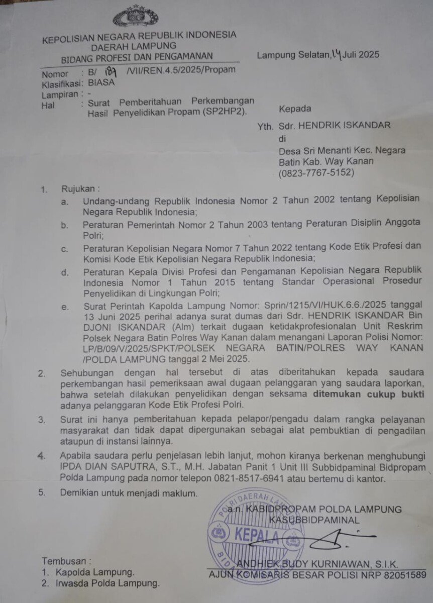 Hal itu tertuang dalam surat Kabid Propam Polda Lampung No