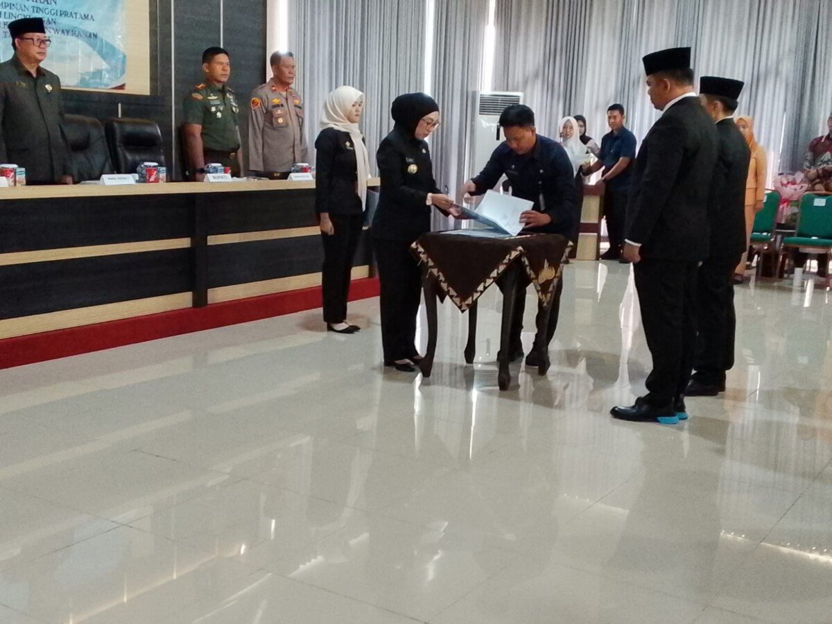 Bupati Way Kanan Ayu Asalasyiah melantik Sekretaris Daerah Kabupaten (Sekdakab) dan Pejabat Pimpinan Pratama Kabupaten Way Kanan bertempat di Ruang Rapat Utama Pemerintah Kabupaten setempat, Senin (21-07-2025).
